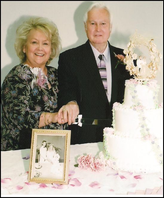Here is a beautiful picture of Linda & her husband cutting their 50th wedding anniversary cake last Saturday. She said: "Being a non-traditionalist, I chose lavender, pink and white as my color theme. Those were our wedding colors. The cake topper is the original one. Note the photo at lower left of us cutting the first cake".